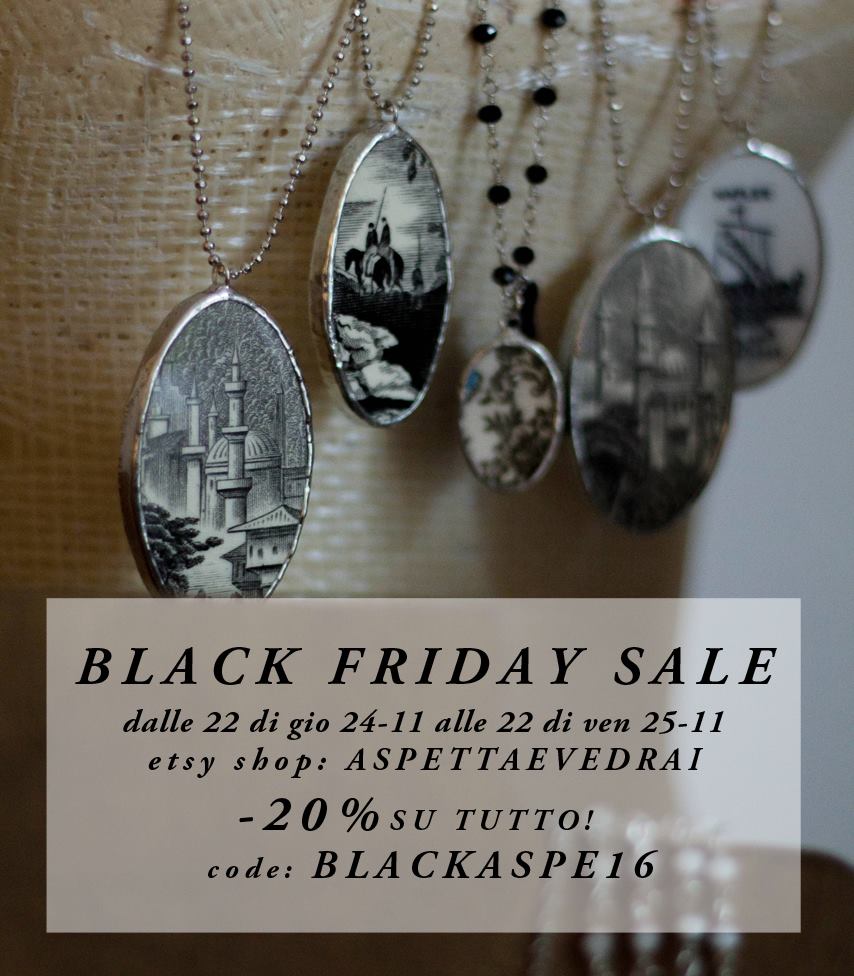 Nato dalla mente creativa di una giovane emiliana, il brand di gioielli handmande Aspettaevedrai aderisce al black friday proponendo uno sconto del 20% su tutti i prodotto. Sull’e-store potrete acquistare i loro gioielli fatti a mano ricavati da materiali di scarto quali i resti di piatti… rotti! Se state cercando il regalo perfetto per la mamma o la sorella o semplicemente qualcosa di unico da indossare durante le feste, questo è il posto giusto per voi!